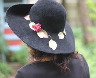 This hat began its life as a Liz Claiborne design, and eventually morphed into a Claiborne-Barton collaboration, after convincing me to take it home from a thrift store even though there were some things I didn't like about it. The hat had a straw crown and brim, with heavy, navy blue fabric holding the two together. I don't like navy blue, so I decided to change the color of the fabric with spray paint. I covered the straw with masking tape, and doused the cloth with burgundy spray paint. It soaked in, and the hat was navy blue again. I applied more paint, which again disappeared into a navy blue muddle.