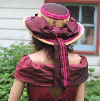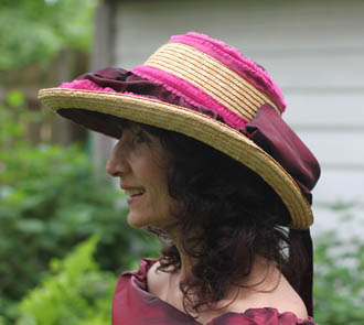Then I had a brainstorm. If I couldn't change its color with paint, I could just cover it, period. So I took burgundy satin and covered most of the hat with that, inside and out. Then I used a glue gun to apply ribbons and lace. The first trim I put on looked rather disappointing, so in frustration, I took it off and replaced it with different edging, but that one was so sheer that the glue showed through. To hide that, I put on yet more lace.